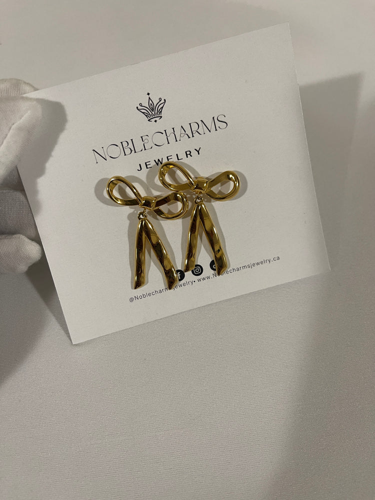 Add a playful yet elegant touch to your look with our Long Bow Tie Earrings, featuring a delicate, flowing design in luxurious 18K gold plating. These graceful drop earrings combine feminine charm with a modern statement, perfect for both special occasions and everyday glam.