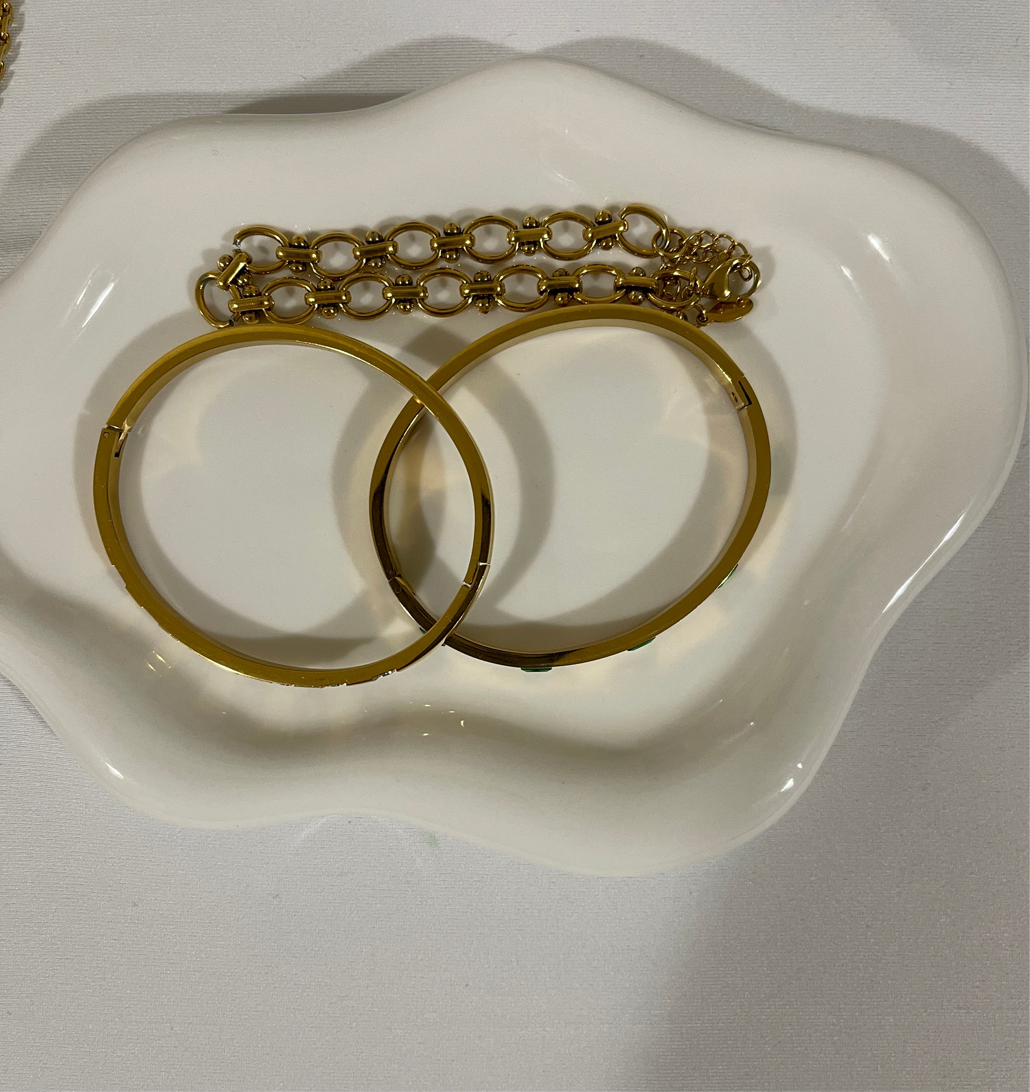 Make a bold yet timeless statement with our 18K Gold-Plated Bangle Bracelet Set. This elegant set features multiple sleek bangles crafted from durable stainless steel and finished with a rich, 18K gold plating for a luxurious shine that lasts.