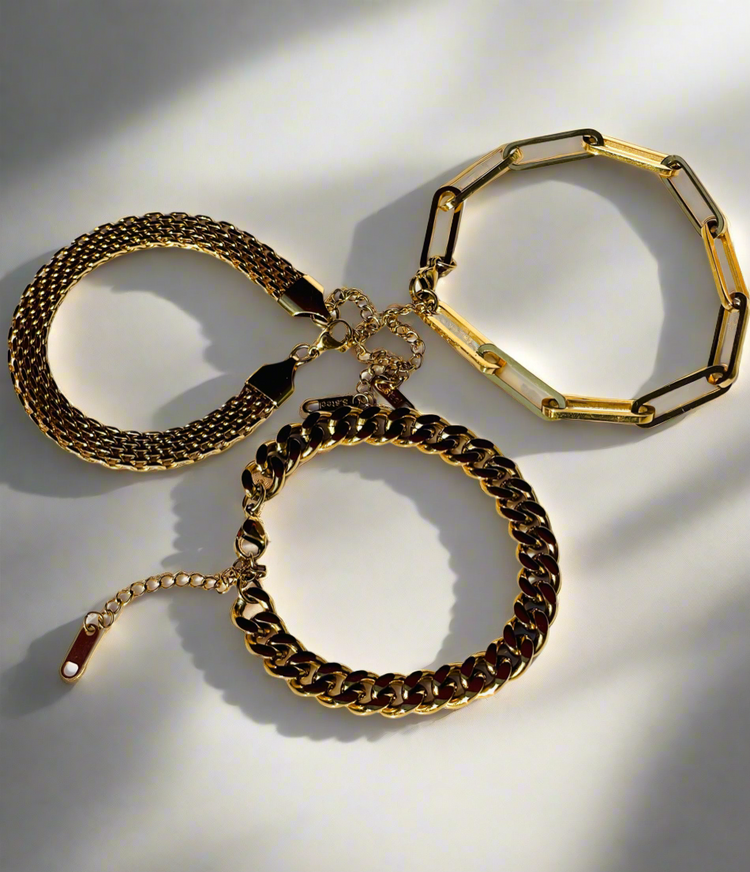 Add effortless elegance and trend-forward style to your wrist with our Gold Paperclip Chain Bracelet Set. Crafted with 18K gold plating over durable stainless steel, these stackable bracelets combine minimalist design with a modern edge. Wear them solo for subtle shine or stack them for a bold, layered look.