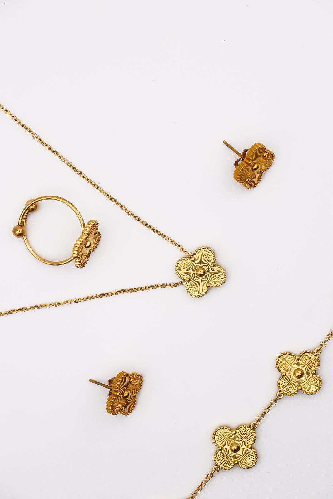 Clover sets-Inspired Gold Jewelry Set – 18K Gold-Plated Clover Necklace, Bracelet & Earrings and Ring