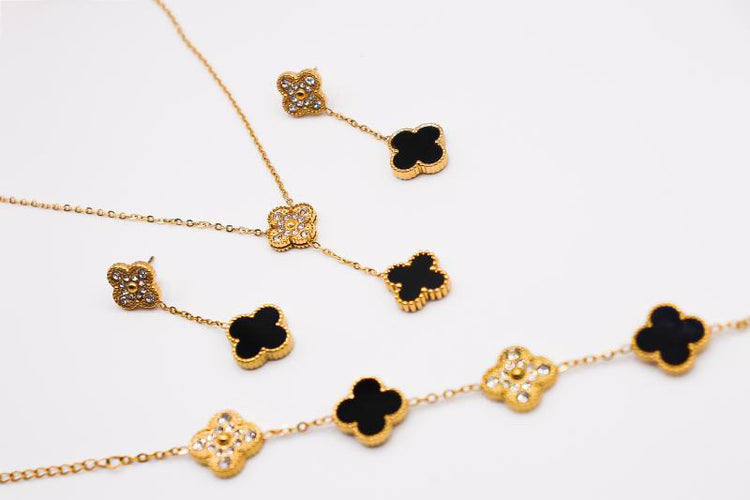 Add a touch of timeless elegance with our Black & Gold Van Cleef-Inspired Jewelry Set, featuring a matching necklace, bracelet, and earrings. Crafted with a luxurious 18K gold-plated finish and sleek black enamel clover design, this set offers the perfect mix of sophistication, femininity, and trend-forward style.